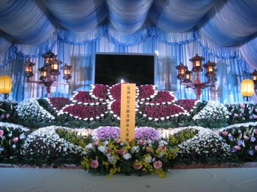 花牌的正前方置灵桌,灵桌后方正中央置四周扎有黄色鲜花的24 时遗像(用黑边镜框)一座,灵桌上通常置备鲜花(黄白菊花为主)、供果、供菜,中间放灵位,两旁置大香烛一对,另有香炉等,如有致送素花篮的可置放灵桌两旁,以八字形排开较宜。